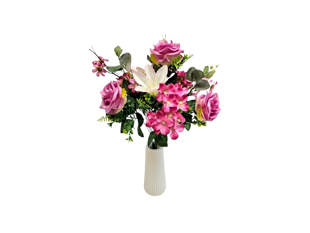Růže & Hortenzie & Lilie kytice fialová 47cm umělá