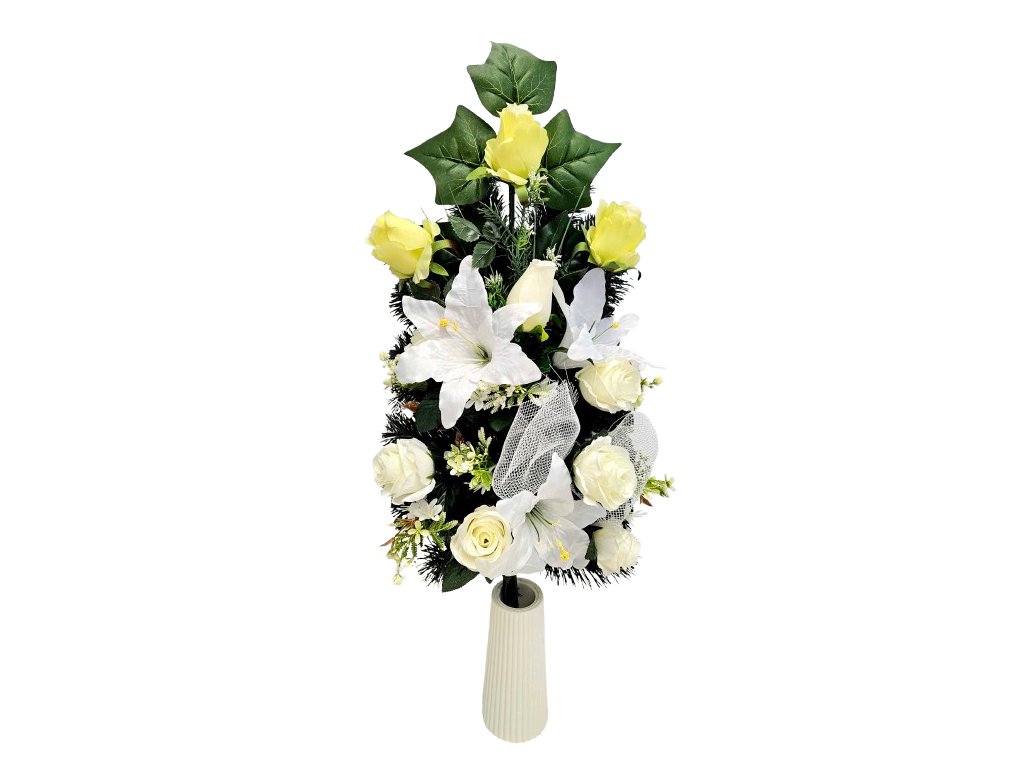Umělá kytice pohřební růže, lilie a doplňky 75cm x 35cm AS865