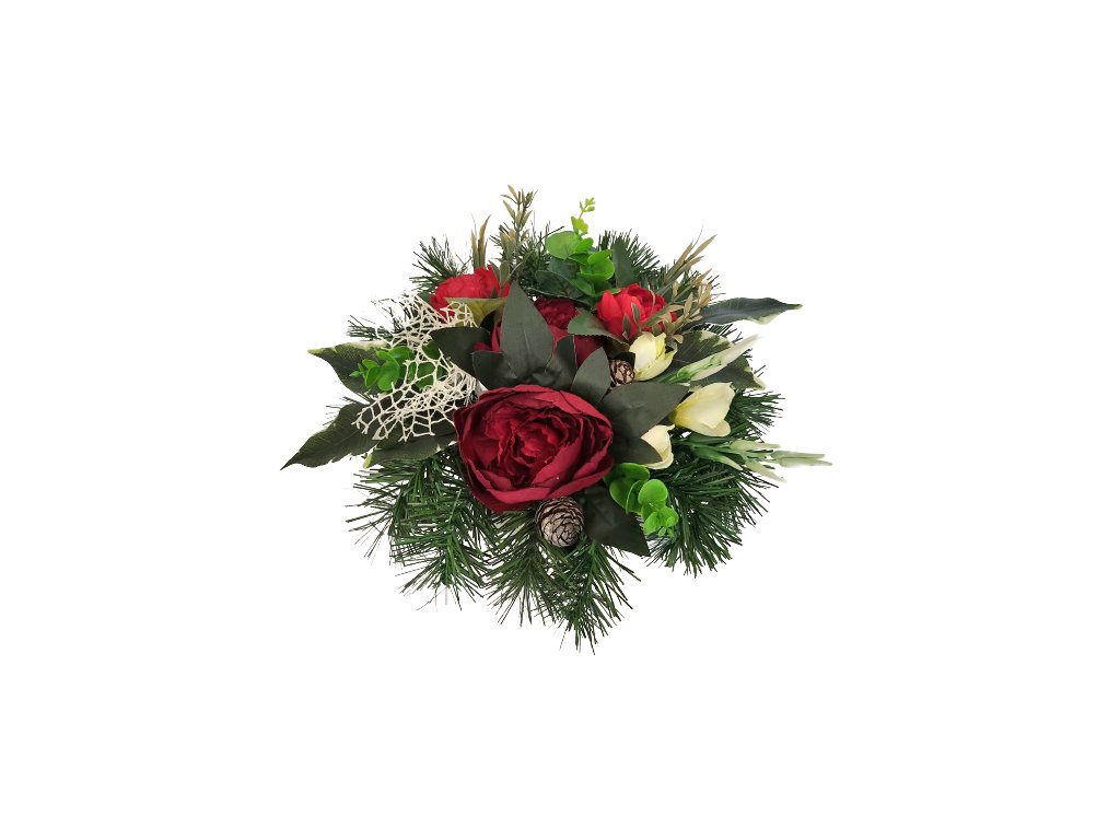 Aranžmán - Zdobená plastová miska s betonem a umělým chvojím Popis: Zdobená plastová miska s betonem a umělým chvojím. Ideální jako dekorace na hrob. Dlouhá životnost. Odolná proti větru. Váha od 0,5kg do 2kg. Ozdobena kvalitními umělými květinami. Květy jsou vyrobeny z hedvábí, látky nebo sametu. Použité květy jsou například umělé Růže, Magnolie, Chryzantémy, Lilie, Karafiáty, Hortenzie, Pivoňky a další. Podle specifikace v názvu produktu. Tyto aranžmány patří mezi naše nejprodávanější produkty
