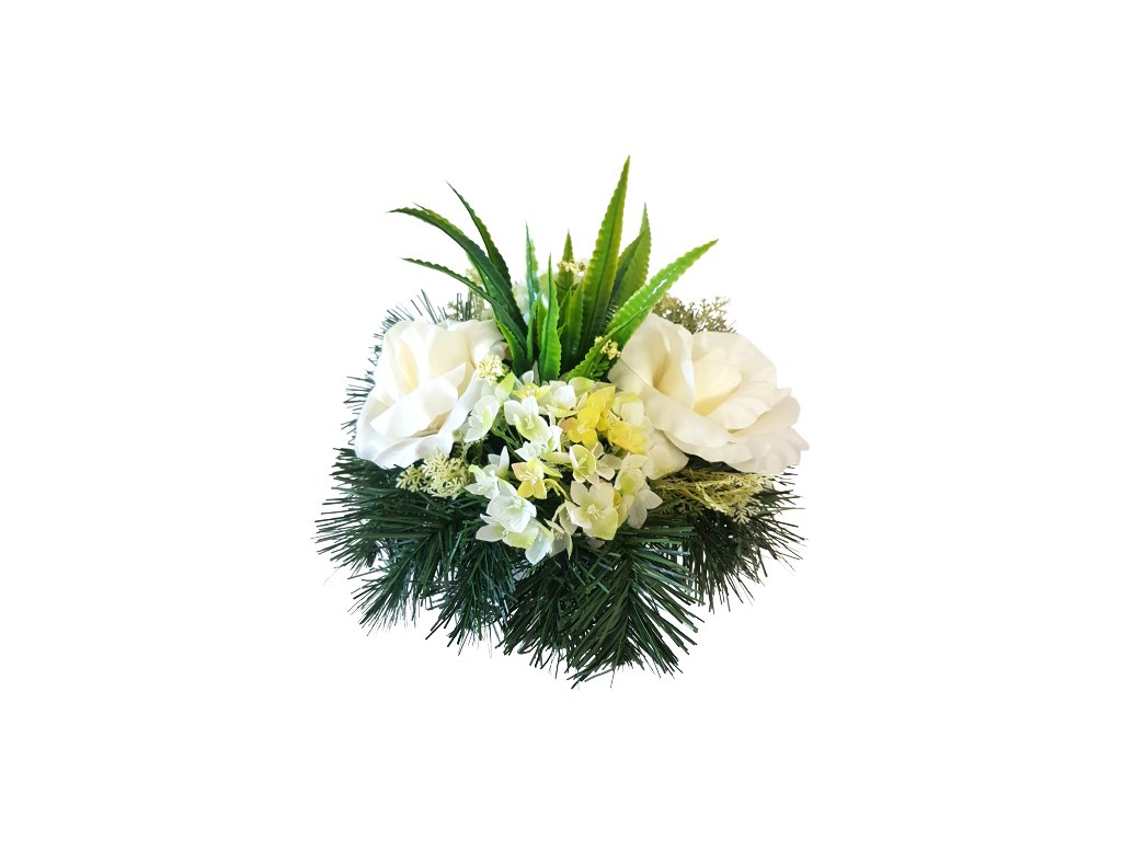 Aranžmán - Zdobená plastová miska s betonem a umělým chvojím Popis: Zdobená plastová miska s betonem a umělým chvojím. Ideální jako dekorace na hrob. Dlouhá životnost. Odolná proti větru. Váha od 0,5kg do 2kg. Ozdobena kvalitními umělými květinami. Květy jsou vyrobeny z hedvábí, látky nebo sametu. Použité květy jsou například umělé Růže, Magnolie, Chryzantémy, Lilie, Karafiáty, Hortenzie, Pivoňky a další. Podle specifikace v názvu produktu. Tyto aranžmány patří mezi naše nejprodávanější produkty