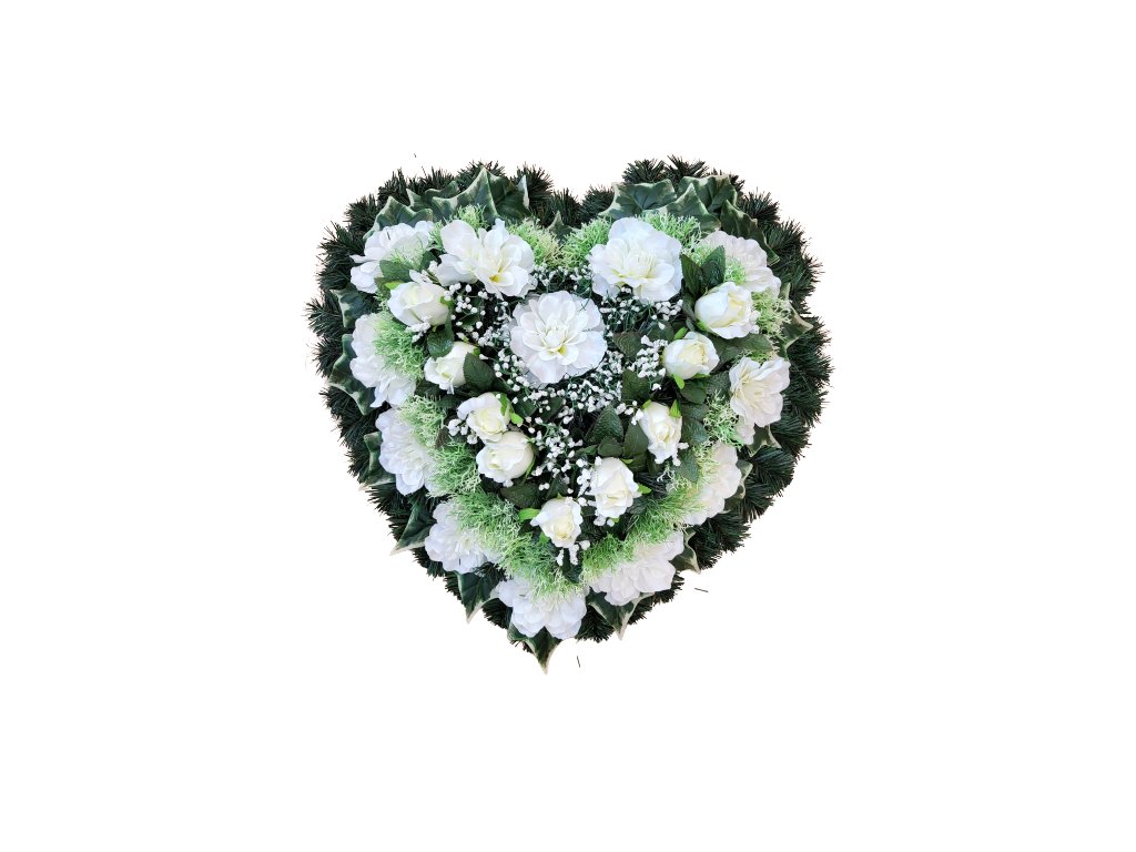 Smuteční věnec ozdobený kvalitními umělými květy Popis: Umělý smuteční věnec může být ve tvaru srdce, listu, slzy, esíčka nebo kruhu. Umělé hedvábné a látkové květiny použité na ozdobení věnce jsou kvalitní s dlouhou životností. Na výrobu používáme různé druhy umělých květin, například Růže, Lilie, Chryzantémy, Hortenzie, Lisianthus, Magnolie, Clematis a další. Dle specifikace v názvu produktu. Realistické umělé květy jsou vyrobeny z hedvábí, z látky nebo sametu. Umelý věnec dodáváme smrkový neb