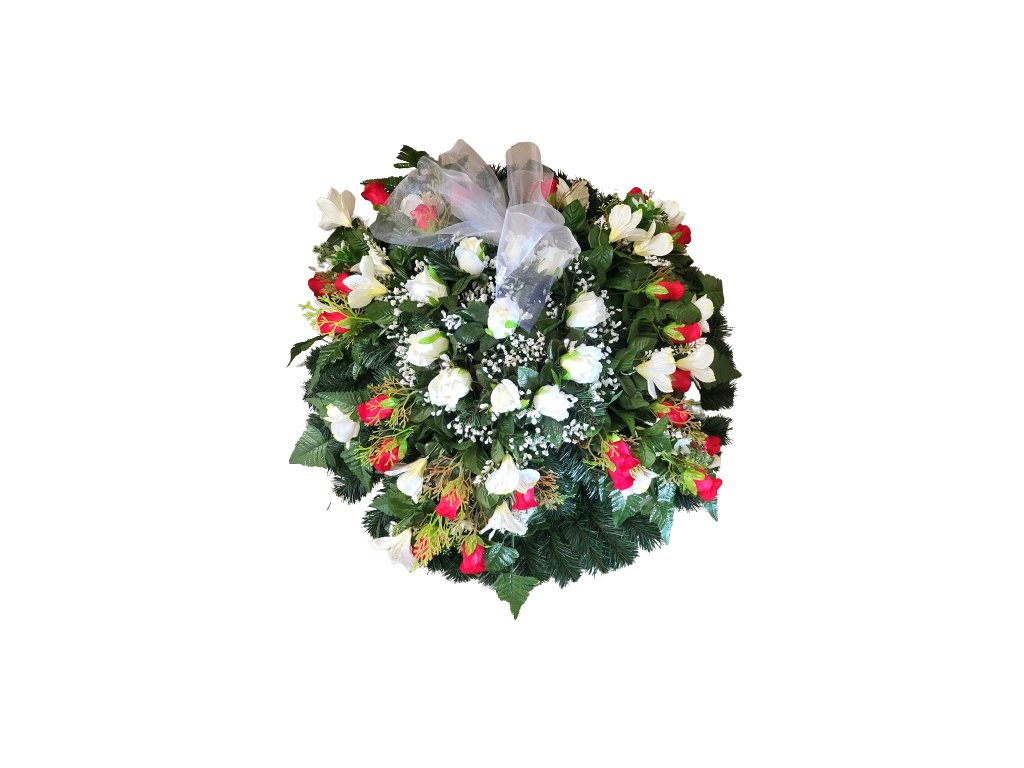 Smuteční věnec ozdobený kvalitními umělými květy Popis: Umělý smuteční věnec může být ve tvaru srdce, listu, slzy, esíčka nebo kruhu. Umělé hedvábné a látkové květiny použité na ozdobení věnce jsou kvalitní s dlouhou životností. Na výrobu používáme různé druhy umělých květin, například Růže, Lilie, Chryzantémy, Hortenzie, Lisianthus, Magnolie, Clematis a další. Dle specifikace v názvu produktu. Realistické umělé květy jsou vyrobeny z hedvábí, z látky nebo sametu. Umelý věnec dodáváme smrkový neb