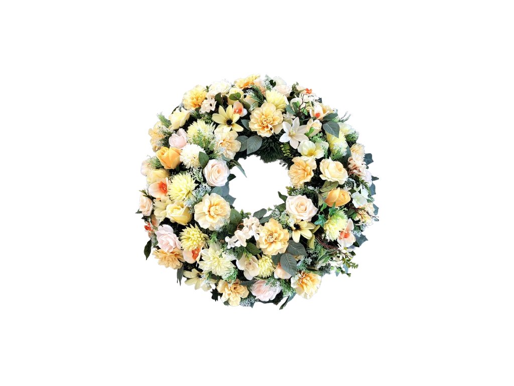 Smuteční věnec ozdobený kvalitními umělými květy. Pro náročné zákazníky, krásný luxusní věnec. Popis: Umělý smuteční věnec může být ve tvaru srdce, listu, slzy, esíčka nebo kruhu. Umělé hedvábné a látkové květiny použité na ozdobení věnce jsou kvalitní s dlouhou životností. Na výrobu používáme různé druhy umělých květin, například Růže, Lilie, Chryzantémy, Hortenzie, Lisianthus, Magnolie, Clematis a další. Dle specifikace v názvu produktu. Realistické umělé květy jsou vyrobeny z hedvábí, z látky