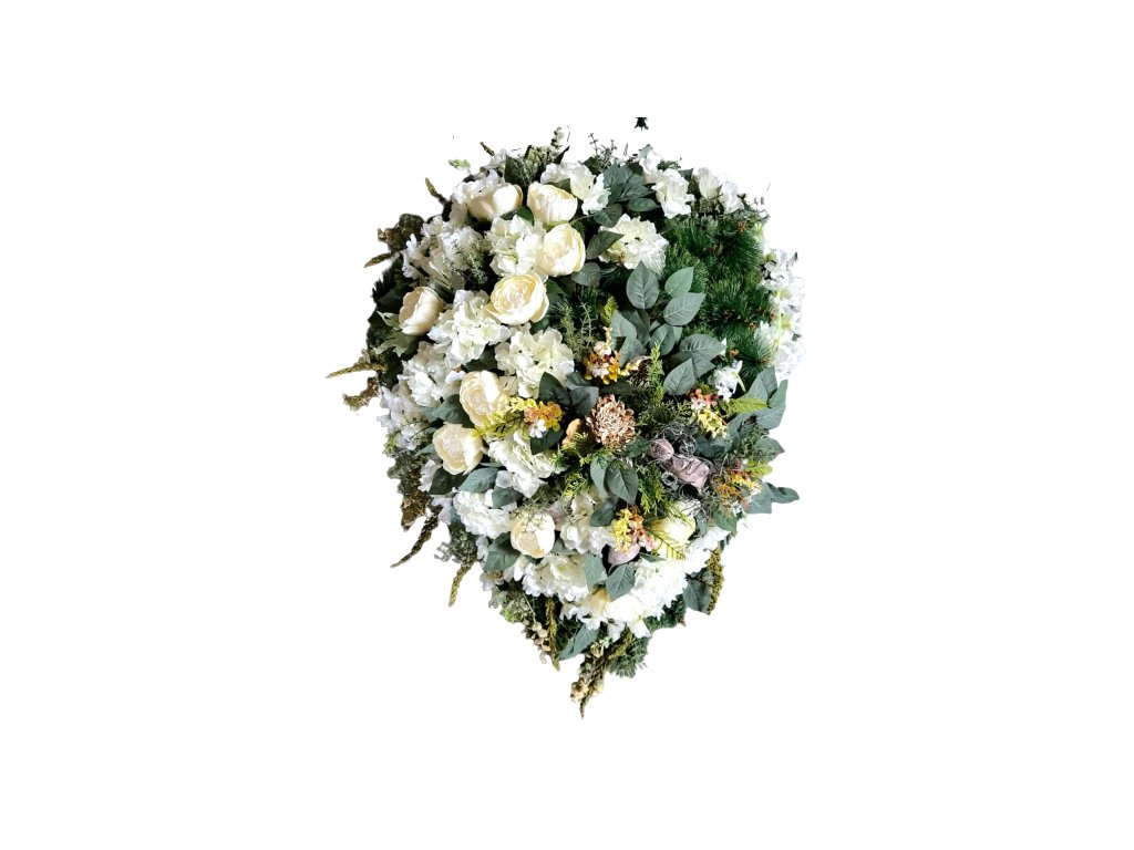 Smuteční věnec ozdobený kvalitními umělými květy. Pro náročné zákazníky, krásný luxusní věnec. Popis: Umělý smuteční věnec může být ve tvaru srdce, listu, slzy, esíčka nebo kruhu. Umělé hedvábné a látkové květiny použité na ozdobení věnce jsou kvalitní s dlouhou životností. Na výrobu používáme různé druhy umělých květin, například Růže, Lilie, Chryzantémy, Hortenzie, Lisianthus, Magnolie, Clematis a další. Dle specifikace v názvu produktu. Realistické umělé květy jsou vyrobeny z hedvábí, z látky