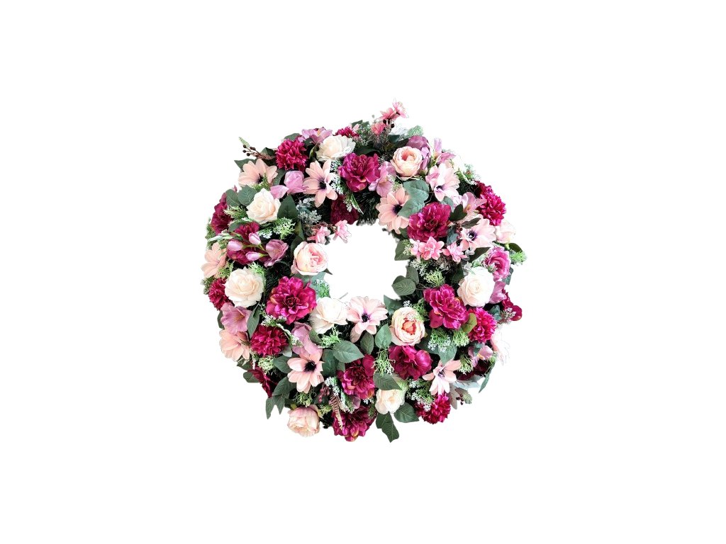 Smuteční věnec ozdobený kvalitními umělými květy. Pro náročné zákazníky, krásný luxusní věnec. Popis: Umělý smuteční věnec může být ve tvaru srdce, listu, slzy, esíčka nebo kruhu. Umělé hedvábné a látkové květiny použité na ozdobení věnce jsou kvalitní s dlouhou životností. Na výrobu používáme různé druhy umělých květin, například Růže, Lilie, Chryzantémy, Hortenzie, Lisianthus, Magnolie, Clematis a další. Dle specifikace v názvu produktu. Realistické umělé květy jsou vyrobeny z hedvábí, z látky