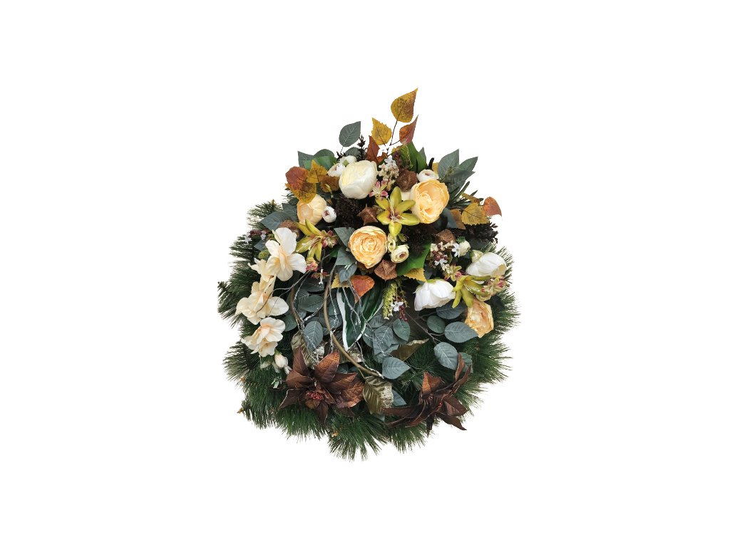 Smuteční věnec ozdobený kvalitními umělými květy. Pro náročné zákazníky, krásný luxusní věnec. Popis: Umělý smuteční věnec může být ve tvaru srdce, listu, slzy, esíčka nebo kruhu. Umělé hedvábné a látkové květiny použité na ozdobení věnce jsou kvalitní s dlouhou životností. Na výrobu používáme různé druhy umělých květin, například Růže, Lilie, Chryzantémy, Hortenzie, Lisianthus, Magnolie, Clematis a další. Dle specifikace v názvu produktu. Realistické umělé květy jsou vyrobeny z hedvábí, z látky