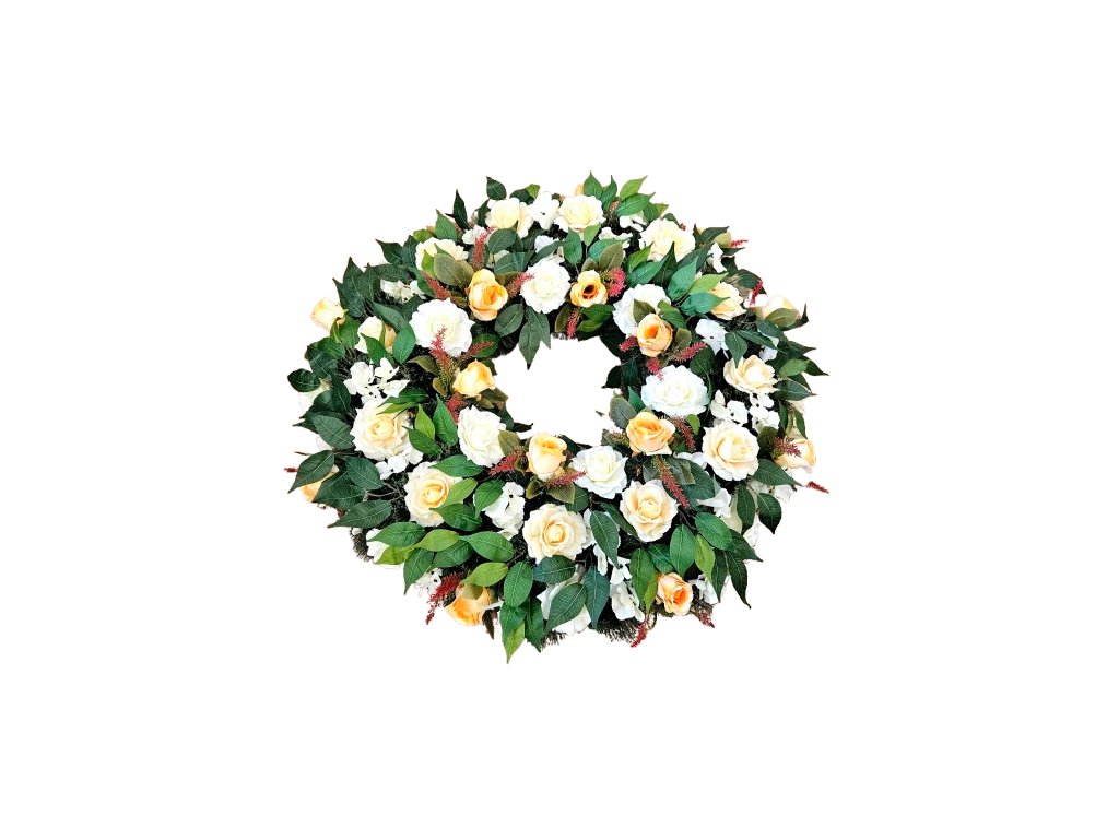 Smuteční věnec ozdobený kvalitními umělými květy. Pro náročné zákazníky, krásný luxusní věnec. Popis: Umělý smuteční věnec může být ve tvaru srdce, listu, slzy, esíčka nebo kruhu. Umělé hedvábné a látkové květiny použité na ozdobení věnce jsou kvalitní s dlouhou životností. Na výrobu používáme různé druhy umělých květin, například Růže, Lilie, Chryzantémy, Hortenzie, Lisianthus, Magnolie, Clematis a další. Dle specifikace v názvu produktu. Realistické umělé květy jsou vyrobeny z hedvábí, z látky