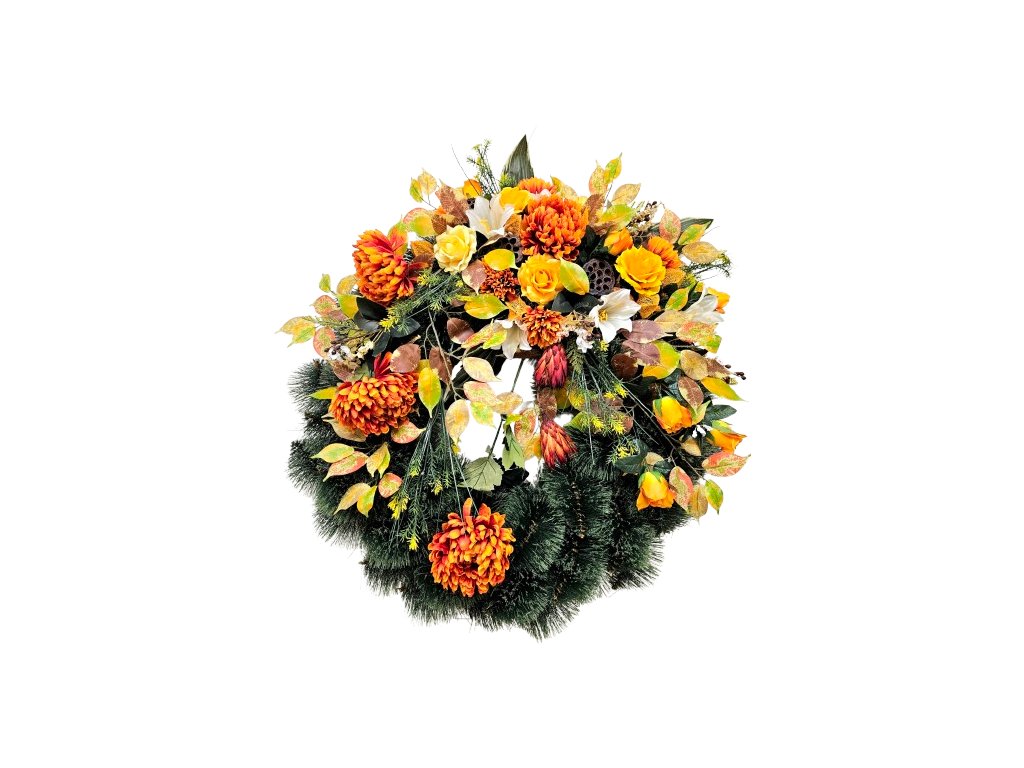 Smuteční věnec ozdobený kvalitními umělými květy. Pro náročné zákazníky, krásný luxusní věnec. Popis: Umělý smuteční věnec může být ve tvaru srdce, listu, slzy, esíčka nebo kruhu. Umělé hedvábné a látkové květiny použité na ozdobení věnce jsou kvalitní s dlouhou životností. Na výrobu používáme různé druhy umělých květin, například Růže, Lilie, Chryzantémy, Hortenzie, Lisianthus, Magnolie, Clematis a další. Dle specifikace v názvu produktu. Realistické umělé květy jsou vyrobeny z hedvábí, z látky