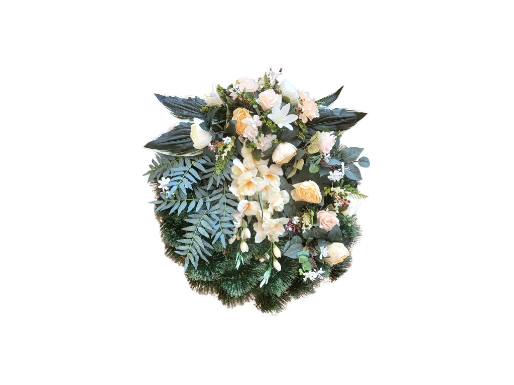 Smuteční věnec borovicový exclusive růže, pivoňky, gladioly mečíky a doplňky 70cm x 80cm AS603