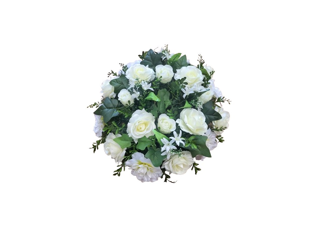 Smuteční věnec ozdobený kvalitními umělými květy. Pro náročné zákazníky, krásný luxusní věnec. Popis: Umělý smuteční věnec může být ve tvaru srdce, listu, slzy, esíčka nebo kruhu. Umělé hedvábné a látkové květiny použité na ozdobení věnce jsou kvalitní s dlouhou životností. Na výrobu používáme různé druhy umělých květin, například Růže, Lilie, Chryzantémy, Hortenzie, Lisianthus, Magnolie, Clematis a další. Dle specifikace v názvu produktu. Realistické umělé květy jsou vyrobeny z hedvábí, z látky