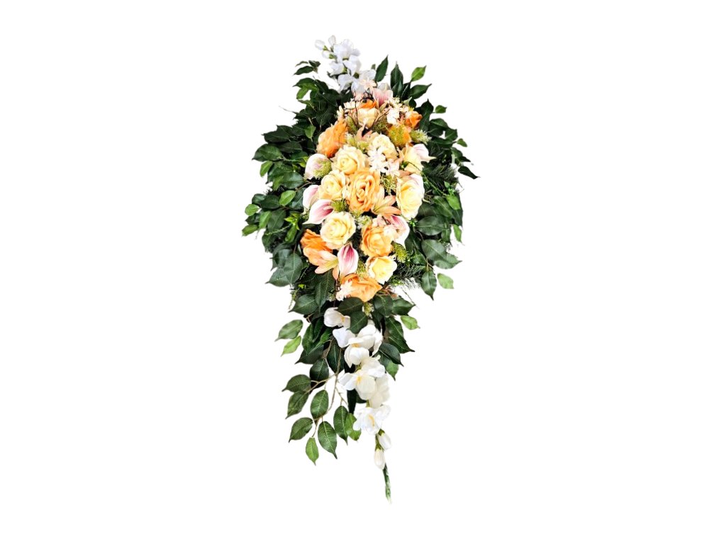 Smuteční věnec esíčko umělé růže, kaly, gladioly a doplňky 130cm x 65cm AS1000