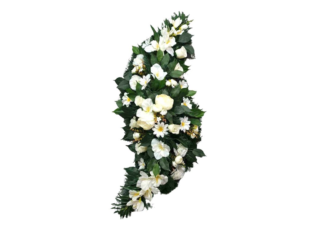Smuteční věnec esíčko z umělých pivoněk peonií, gladiol, kopretin 100cm x 35cm bílá, zelená, krémová AS356