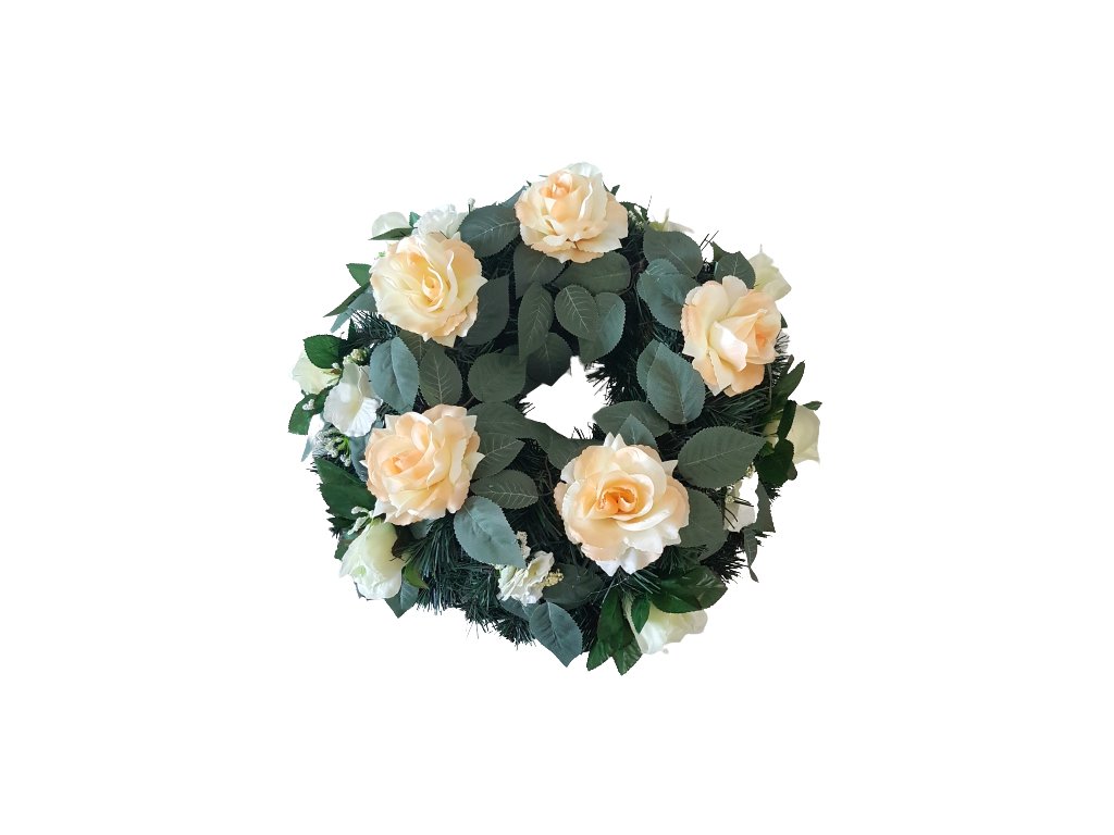 Smuteční věnec kruh s umělými růžemi, hortenziemi a doplňky 50cm krémový, růžový, zelený AS398