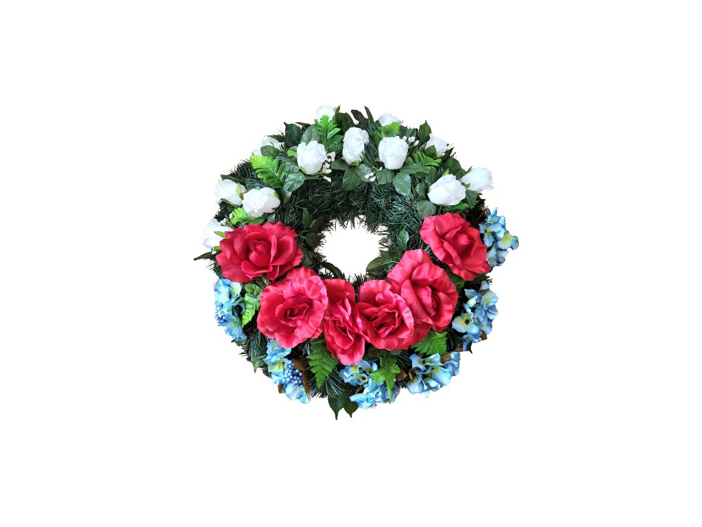 Smuteční věnec s umělými růžemi a hortenziemi 65cm bílá, zelená, modrá AS653