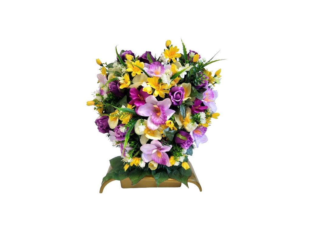 Aranžmán - Zdobená plastová miska s betonem a umělým chvojím Popis: Zdobená plastová miska s betonem a umělým chvojím. Ideální jako dekorace na hrob. Dlouhá životnost. Odolná proti větru. Váha od 0,5kg do 2kg. Ozdobena kvalitními umělými květinami. Květy jsou vyrobeny z hedvábí, látky nebo sametu. Použité květy jsou například umělé Růže, Magnolie, Chryzantémy, Lilie, Karafiáty, Hortenzie, Pivoňky a další. Podle specifikace v názvu produktu. Tyto aranžmány patří mezi naše nejprodávanější produkty