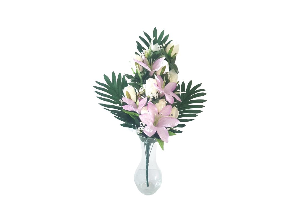 Růže a Lilie kytice x18 fialová, bílá 62cm umělá