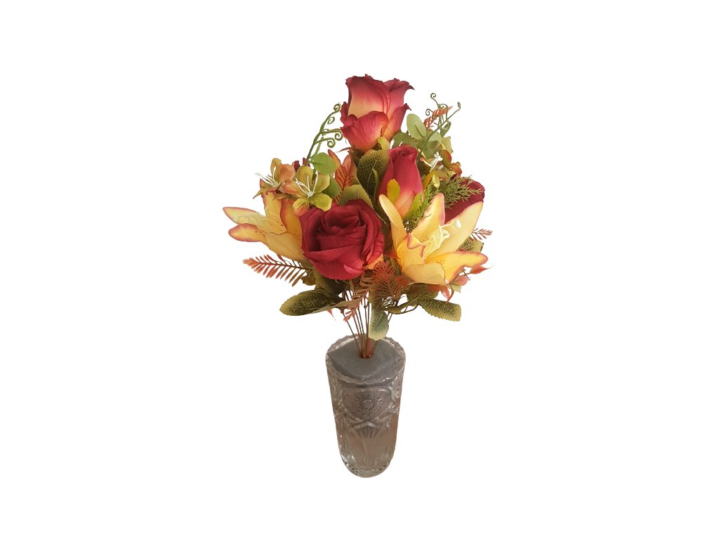 Umělá kytice Růže & Lilie x12 48cm vínová & žlutá umělá