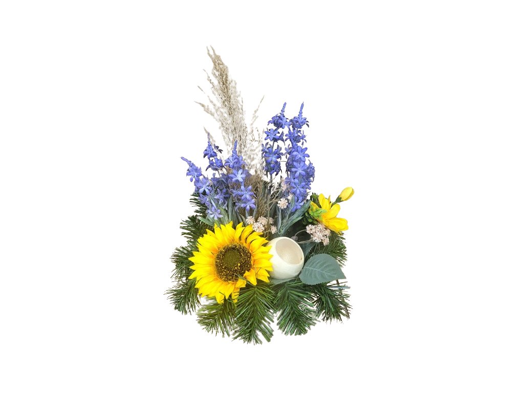 Smuteční aranžmán betonka umělá slunečnice, levandule, kopretina a doplňky 26cm x 22cm x 38cm AS732